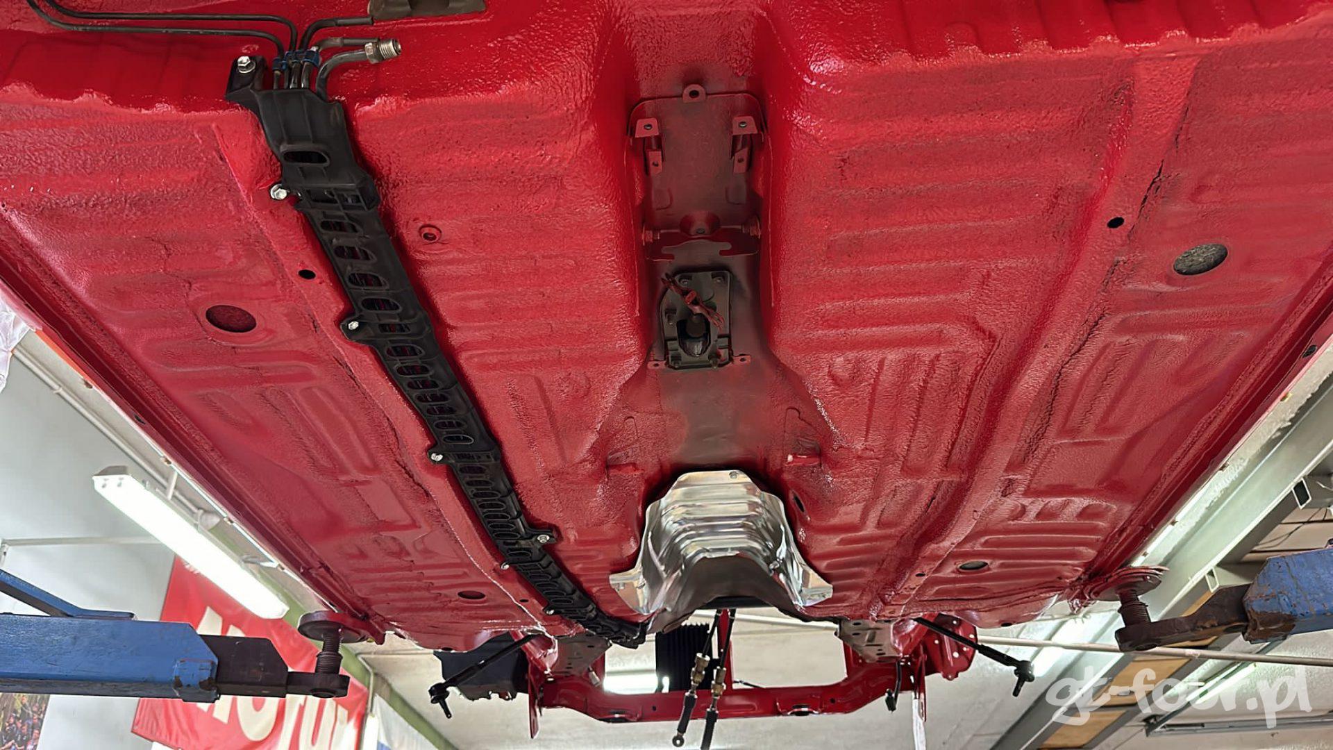 I tak też się stało – podwozie zostało kompleksowo rozbrojone, a elementy zawieszenia oddane do piaskowania i lakierowania proszkowego. Całość podwozia została odnowiona, położony nowy lakier typu „baranek” oraz zabezpieczone antykorozyjnie. Całość prezentuje się teraz jakby dosłownie wyjechało wczoraj z fabryki 🙂
